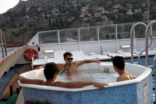 Bazı turistlerin ise gemiden inmeden güneşlendiği görüldü.