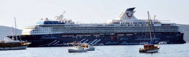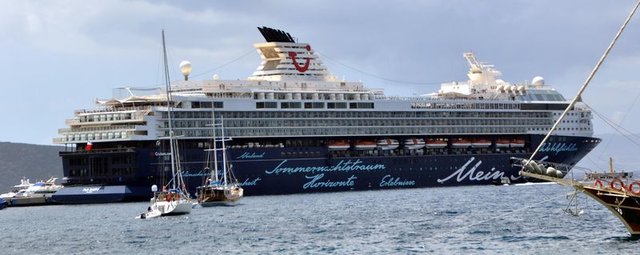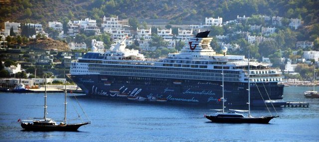 Bodrum Gemi Yanaşma İskelesi'ne demirleyen Malta bayraklı 265 metre uzunluğundaki yolcu gemisi 'Mein Schiff 2', bu sezon ilçeye 7'nci seferini yaptı. Gemiyle ilçeye çoğunluğu Alman 2 bin 160 turist geldi.