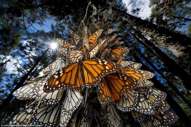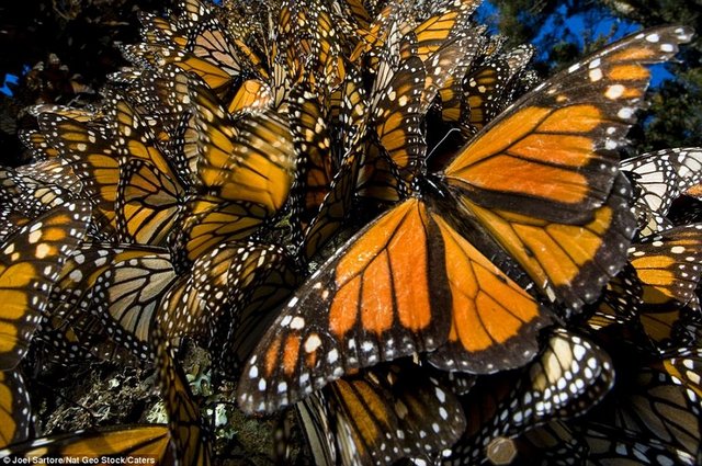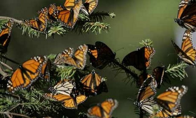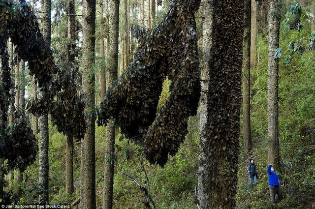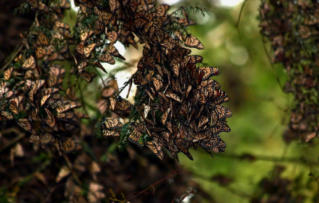Kuzey Amerika'dan sıcak iklimi dolayısıyla Meksika'ya 4 bin kilometre mesafeyi aşarak gelen kelebekler, ağaçları yuva yapıyor ve neredeyse ağaçta 1 milimetre bile yer bırakmıyorlar.