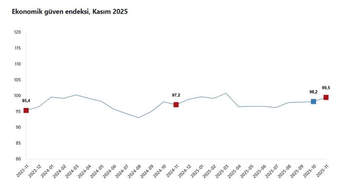 TÜİK'in açıkladığı verilere göre ekonomik güven endeksi Ekim ayında 98,2 iken, Kasım ayında yüzde 1,3 oranında artarak 99,5 oldu