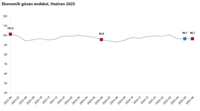 Ekonomik güven endeksi mayıs ayında 96,65 iken, haziran ayında yüzde 0,1 oranında artarak 96,71 değerini aldı.