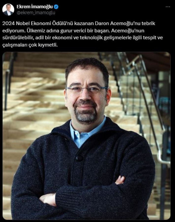 İstanbul Büyükşehir Belediye Başkanı Ekrem İmamoğlu ve Ankara Büyükşehir Belediye Başkanı Mansur Yavaş Nobel Ekonomi Ödülü'nü kazanan Prof. Dr. Daron Acemoğlu'nu tebrik etti