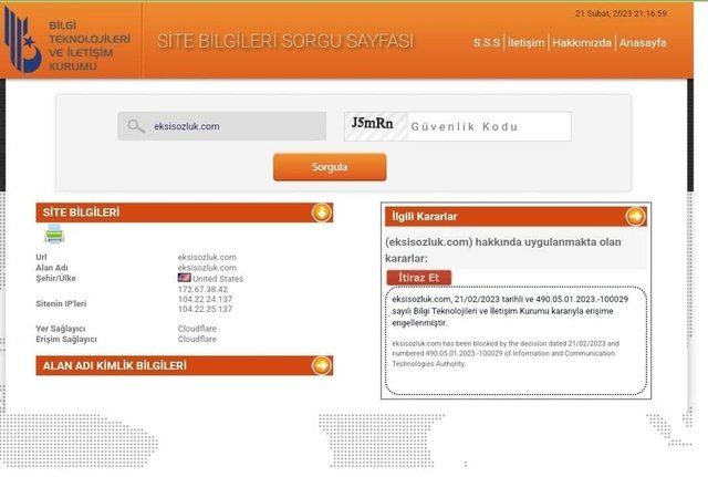 BTK site bilgileri sorgu sayfasında "eksisozluk.com, 21/02/2023 tarihli ve 490.05.01.2023.-100029 sayılı Bilgi Teknolojileri ve İletişim Kurumu kararıyla erişime engellenmiştir." açıklaması yer alıyor.
