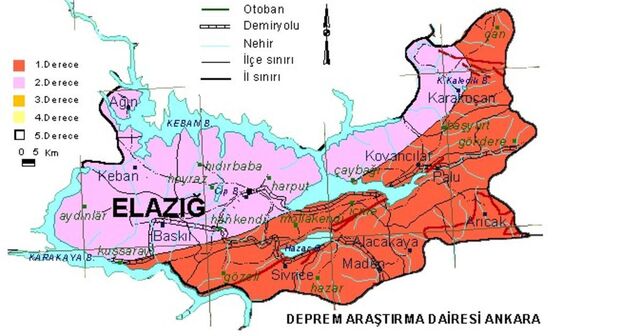 Deprem Araştırma Dairesi Ankara haritasına göre; Elazığ'da Karakoçan, Palu, Kovancılar, Arıcak,Maden, Alacakaya, Sivrice bölgeleri birinci derece deprem bölgesi olarak karşımıza çıkmaktadır.