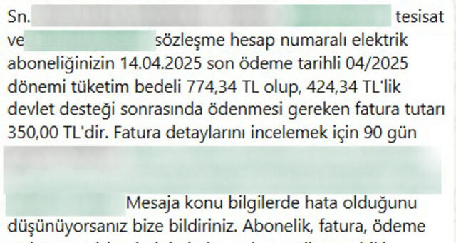Gelen örnek mesajlardan birisinde "... sözleşme hesap numaralı elektrik aboneliğinizin 14.04.2025 son ödeme tarihli 04/2025 dönemi tüketim bedeli 774,34 TL olup, 424,34 TL'lik devlet desteği sonrasında ödenmesi gereken fatura tutarı 350,00 TL'dir" notu yer aldı.