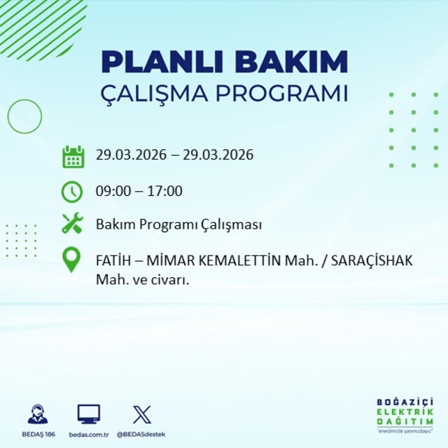 Boğaziçi Elektrik Dağıtım A.Ş tarafından yapılan duyuruya göre 29 Mart Pazar günü İstanbul'da farklı saat aralıklarında bazı ilçelerde elektrik kesintileri yaşanacak.