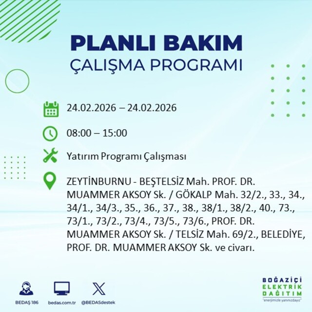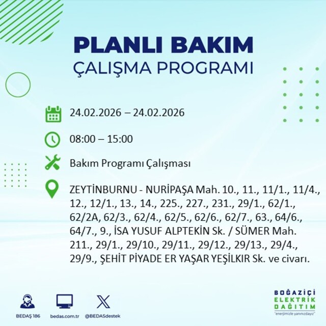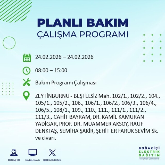 24 Şubat Salı günü için İstanbul’da planlı elektrik kesintisi uyarısı yapıldı. Avrupa Yakası’nda arıza giderme ve şebeke yenileme çalışmaları nedeniyle bazı ilçelerde geçici süreli elektrik kesintileri uygulanacak. Boğaziçi Elektrik Dağıtım A.Ş. (BEDAŞ) tarafından yayımlanan günlük kesinti listesinde, kesintiden etkilenecek mahalleler ile elektriklerin yeniden verileceği saat bilgileri yer aldı. Vatandaşlar ise “İstanbul’da elektrikler ne zaman gelecek?” sorusuna yanıt arıyor. İşte 24 Şubat Salı İstanbul elektrik kesintisi detayları…