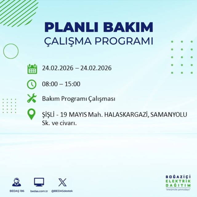 İstanbul'da yaşayan milyonlarca kişi, 24 Şubat Salı günü planlı elektrik kesintisi olup olmadığını araştırıyor. Boğaziçi Elektrik Dağıtım A.Ş. (BEDAŞ), Avrupa Yakası'nda yürütülecek bakım ve altyapı çalışmaları kapsamında bazı ilçelerde elektrik kesintisi uygulanacağını duyurdu. İlçe ve mahalle bazında paylaşılan kesinti programı ile birlikte elektriklerin hangi saat aralığında kesileceği ve ne zaman yeniden verileceği de netlik kazandı. Peki, 24 Şubat Salı günü İstanbul'da elektrikler saat kaçta kesilecek, hangi ilçelerde kesinti yaşanacak? İşte BEDAŞ'ın güncel elektrik kesintisi duyuruları…
