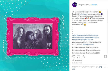 Eleq ipucu sorusu cevabı belli oldu. 12 Nisan Eleq ipucu sorusu Instagram'dan, "Bugün 90’ların müzik gruplarından birini soracağız sizlere. Solo kariyerinde 2 albüm olan Yavuz Çetin’in iki arkadaşıyla birlikte kurduğu grubun adı nedir, hatırladınız mı?" şeklinde yayınlandı. Eleq bu akşam 20.00!da takipçilerinin karşısına çıkacak. Eleq ipucu cevabı haberimizde...