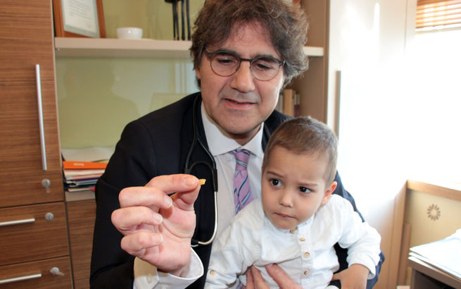 2,5 yaşındaki Emir, nefes borusuna kaçan fıstığın son anda çıkarılabilmesiyle ölümün eşiğinden döndü. Ancak, çıkarılan aslında fıstığın sadece küçük bir parçasıydı. O akşamdan itibaren küçük çocuk ve ailesi üç ay sürecek kabus dolu günlere uyandı. Gittikleri hekimlerden, lösemiden bile şüphelenen oldu. Göğüs Hastalıkları Uzmanı Prof. Dr. Reha Baran’a başvuran aile, “Reha hocamız fıstığı çıkardı ve oğlumuz yeniden doğdu, tabi onunla birlikte biz de” dedi.