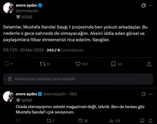 Sosyal medya hesabından açıklama yapan Aydın, "Selamlar. 'Mustafa Sandal Saygı 1' projesinde ben yokum arkadaşlar. Bu nedenle o gece sahnede de olmayacağım. Aksini iddia eden görsel ve paylaşımlara itibar etmemenizi rica ederim. Orada olamayışımın sebebi magazinsel değil, tamamen teknik. Ben de herkes gibi Mustafa Sandal’ı çok seviyorum" ifadelerini kullandı.
