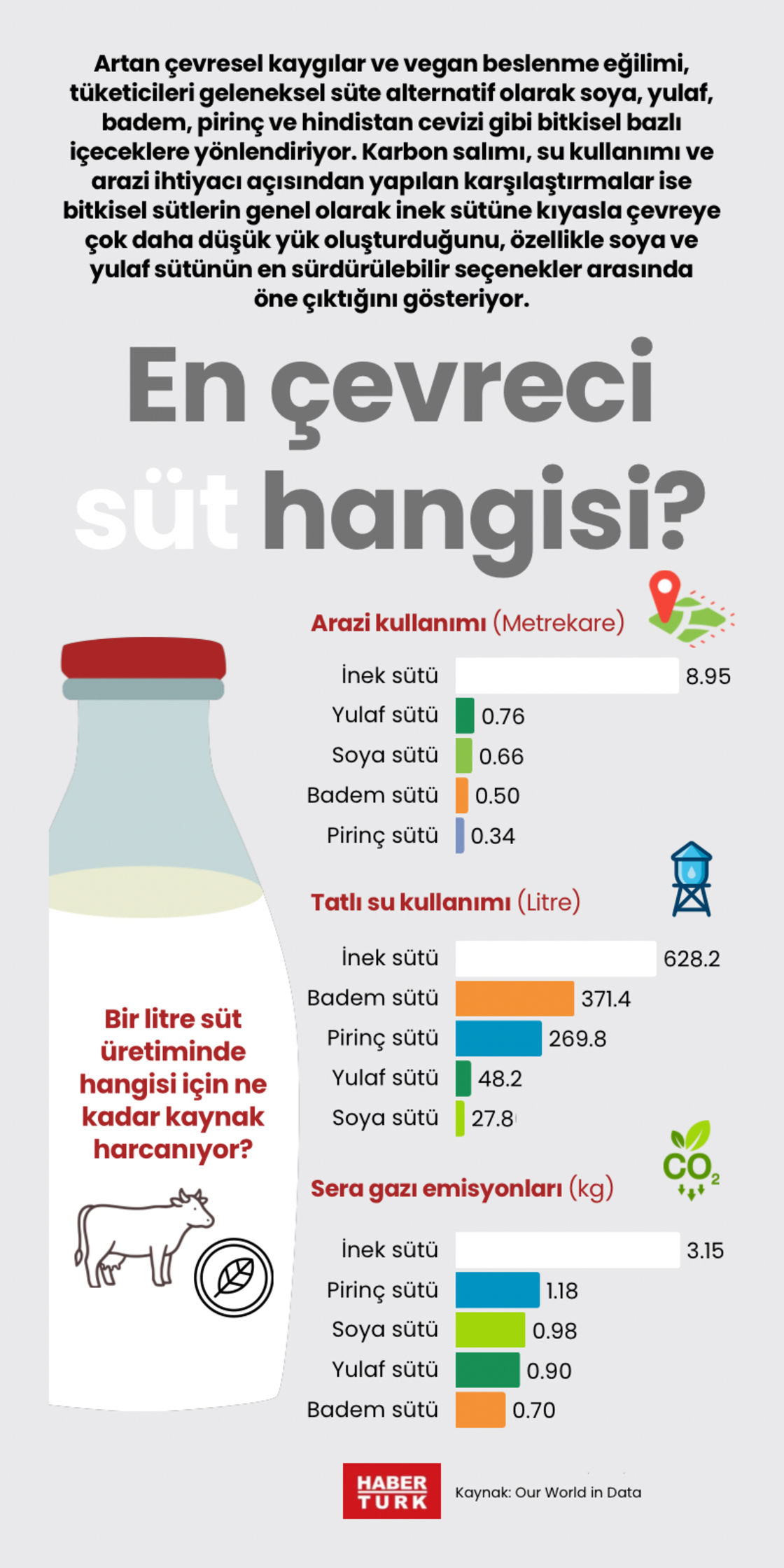 Artan çevresel kaygılar ve vegan beslenme eğilimi, tüketicileri geleneksel süte alternatif olarak soya, yulaf, badem, pirinç ve hindistan cevizi gibi bitkisel bazlı içeceklere yönlendiriyor. Karbon salımı, su kullanımı ve arazi ihtiyacı açısından yapılan karşılaştırmalar ise bitkisel sütlerin genel olarak inek sütüne kıyasla çevreye çok daha düşük yük oluşturduğunu, özellikle soya ve yulaf sütünün en sürdürülebilir seçenekler arasında öne çıktığını gösteriyor.
