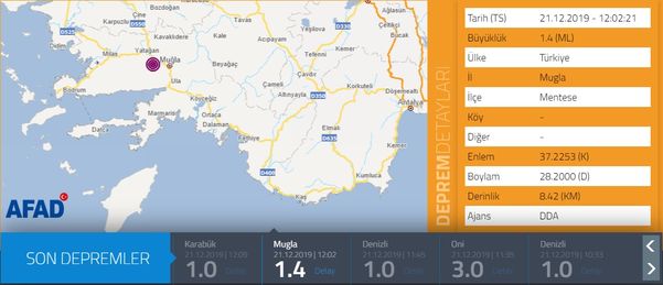 Kandilli Rasathanesi ve AFAD verilerine göre Türkiye ve çevresinde meydana gelen son depremleri sizler için derledik. Bugün öğlen saatlerinde Muğla'da 1.9 büyüklüğünde bir deprem meydana geldi. AFAD depremin büyüklüğünü 1.4 olarak açıkladı. Kandilli Rasathanesi ve AFAD Akdeniz depremine ilişkin verileri aktarmaya devam ediyor. İşte 21 Aralık son deprem listesi...