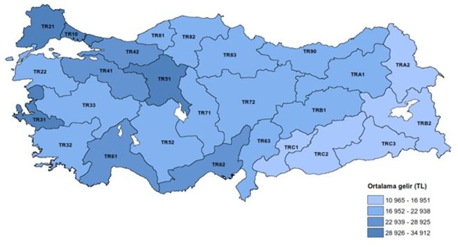 Ortalama yıllık eşdeğer hanehalkı kullanılabilir fert gelirinin en düşük olduğu bölgeler ise 10 bin 965 TL ile TRB2 (Van, Muş, Bitlis, Hakkari), 11 bin 204 TL ile TRC3 (Mardin, Batman, Şırnak, Siirt) ve 11 bin 357 TL ile TRC2 (Şanlıurfa, Diyarbakır) şeklinde sıralandı.