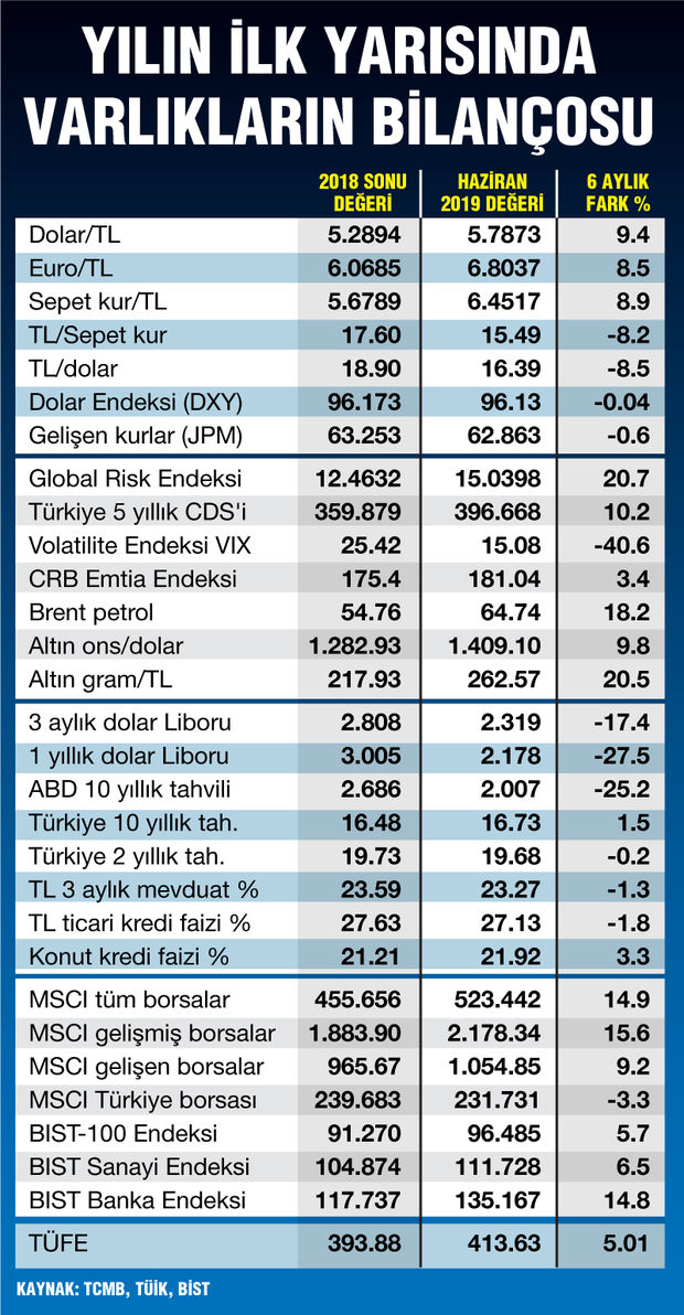 -Bu sırada faizi indiren sadece Türkiye de olmayacak. Dünyada da faiz indirimleri genel bir eğilim olarak başladı. Bitişikte yer alan yılın ilk yarısına ait finansal varlıkların seyrine bakınca bu durum net olarak görülüyor.