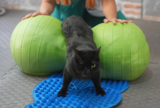 Bursa'da 4 yıl önce otomobilin çarpması sonucu sağ gözünü kaybeden ve omurgasında kırıklar oluşan Zeytin isimli kedi, fizik tedavi ve egzersizlerle yeniden adım atmaya başladı.