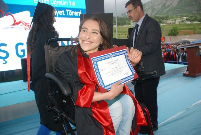 Aynı ilçede, yine engelliler için meslek lisesi vardı. Ama öğretmenleri farklı hayaller de kurabileceğini söyledi: “Müdürümüz Serdar Fırat ve öğretmenlerim beni çalıştırmak için özel kitaplar aldı. Anladım ki eğer gayret ediyorsan, birileri mutlaka fark ediyor ve yardımcı oluyor” diyor.