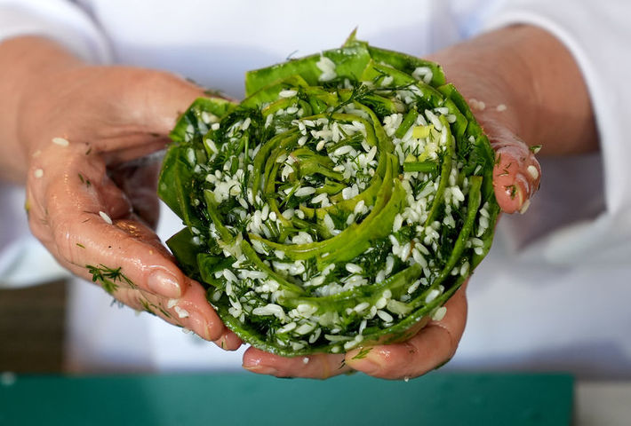Dolmanın iç harcının kuru soğan, taze soğan, dereotu ve pirinç gibi temel malzemelerden oluştuğunu anlatan Kaygusuzer, bol zeytinyağı kullanımının yemeğe lezzet kattığını vurguladı.