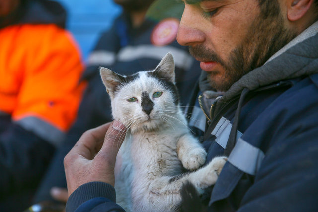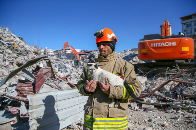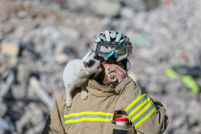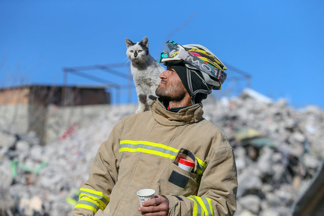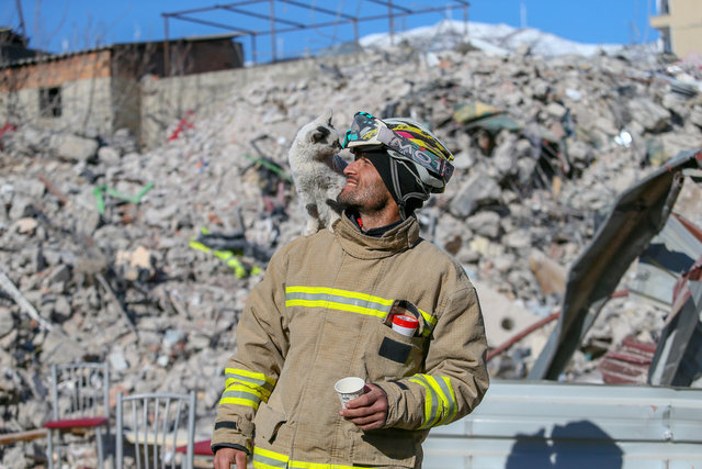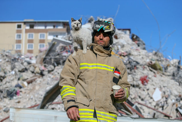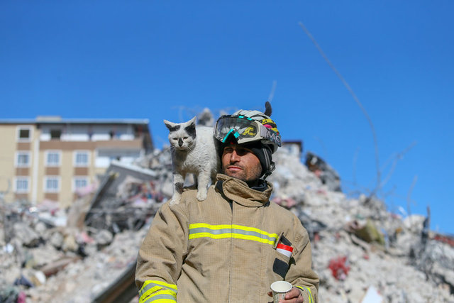 'Asrın felaketi' sonrası çok sayıda binanın yıkıldığı Nurdağı'nda arama kurtarma çalışması yürüten Mardin İtfaiyesi ekibinin bir enkazdan çıkardığı ve ismini Enkaz koyduğu kedi, ekibin can dostu oldu