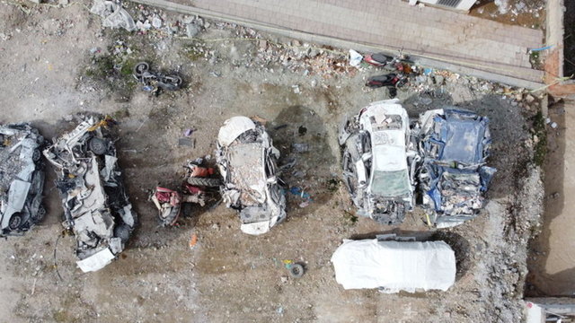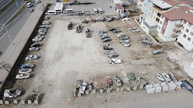 Kentin farklı noktalarından kaldırılan enkazların altından güçlükle çıkartılan, çoğu zaman 2-3 parçaya ayrılan otomobillerin bir çoğunun üstünde ise depremden arta kalan molozlar bulunuyor.