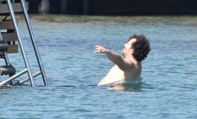 Önce Kütük, denize girmek için merdivenlerden indi. Ünlü oyuncu, o sırada ayağıyla kendisine şaka yapan eşine kızdı.