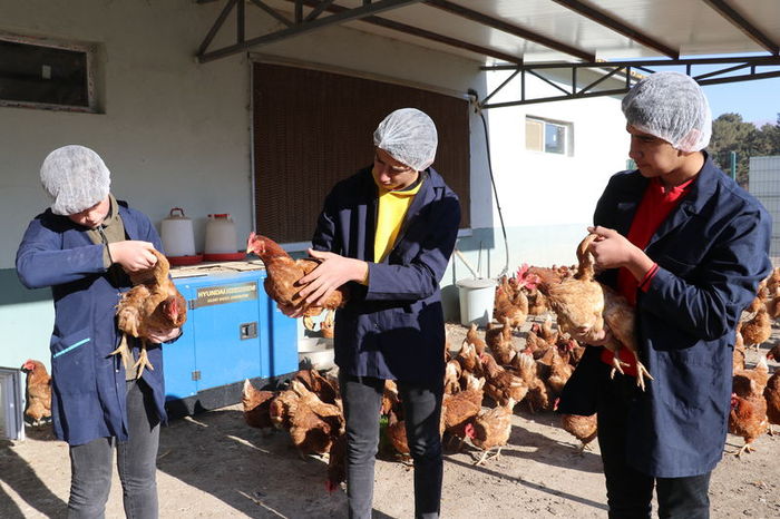 Öğrenciler, sınıflardaki teorik derslerin ardından serada ellerinde çapalarla uygulamalı eğitim görüyor. Kanatlı hayvan alanları, tarım aletleri atölyesi ve tarım laboratuvarları gibi alanlarda da liseliler uygulamalı eğitim alıyor.