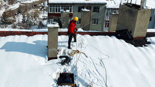 Dağcılık ekipmanlarıyla güvenliklerini sağlayan ekipler, bacalara sabitlenen hatlar üzerinden çatılara inerek biriken kar ve buzları kontrollü şekilde temizliyor.