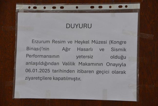 Ahmet Yer, "Rölöve ve Anıtlar Müdürlüğümüzün yaptığı ihale sonucu Erzurum Teknik Üniversitesi (ETÜ) yapının incelenmesi için işi üstlendi. 1 Ağustos 2025 tarihinde ETÜ ile sözleşmeyi imzaladıktan sonra 5 Ağustos'ta yer tesliminde bulunduk. ETÜ'nün alanında uzman heyeti, binamızda inceleme yaptılar. 22 Aralık 2025 tarihinde inceleme raporunu bize sundular. Raporda, binanın ağır hasarlı olduğu ve sismik performansının yetersiz olduğu bildirildi. ETÜ raporunda can ve mal güvenliği açısından kongre binamızın acilen ziyarete kapatılmasını ve en kısa sürede de tahliye edilmesi noktasında bize bir rapor sundular. Bizler de Güzel Sanatlar Genel Müdürlüğümüzle istişareler yaparak gerekli önlemleri aldık. Binamızın can ve mal güvenliği açısından tehdit oluşturması dolayısıyla ziyarete kapatılması noktasında karar aldık" diye konuştu.