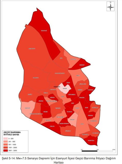 Esenyurt’ta Mw=7.5 senaryo depremi sonrasında yaklaşık 67.410 hanelik acil barınma ihtiyacının ortaya çıkacağı tahmin edilebilir. Hane başına 3 kişilik nüfus kabulüyle, yaklaşık 202.230 kişinin acil barınma ihtiyacı olacağı beklenmektedir.