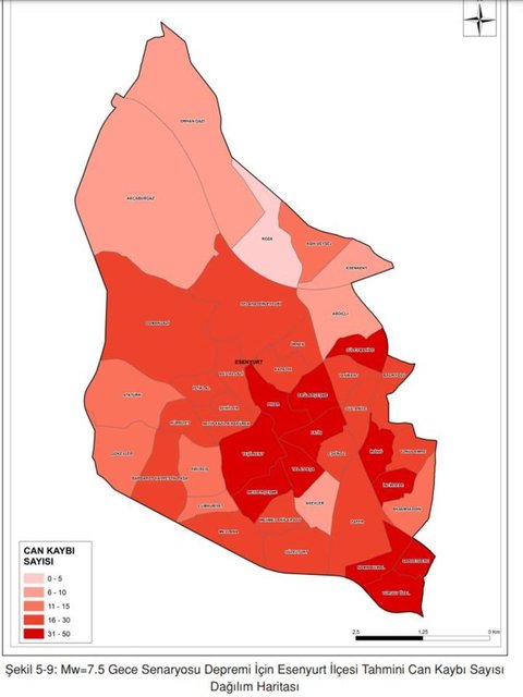7.5 büyüklüğündeki senaryo depreminin, en kötü senaryo olan gece meydana gelmesi halinde, Esenyurt’ta ortalama 1.003 civarında can kaybı meydana gelebileceği, yaklaşık 543 kişinin ağır yaralanabileceği ve 2.789 kişinin de hastane şartlarında tedavi görmesi gerekebileceği öngörülmektedir.
