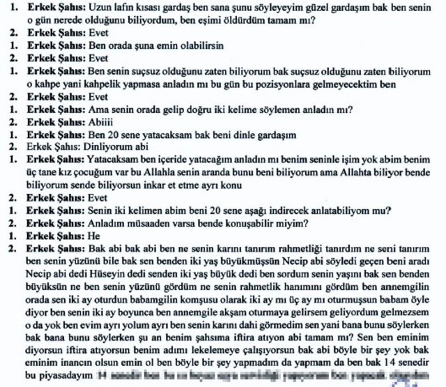Telefon görüşmesinin devamında Hüseyin Akbulut'un, "Bu konu kimsenin ağzından çıkmaz. Sen gel mahkemede ifadeni ver" dediğini, E.Y.'nin ise "Eğer ben böyle bir şey yaptıysam delili ispatı vardır. Mahkeme beni çağırırsa giderim. Delili ispatı varsa polis gelir beni evimden alır ama ben böyle bir şey yapmadım bu senin bana attığın bir iftira" diye yanıt verdiği bildirildi.