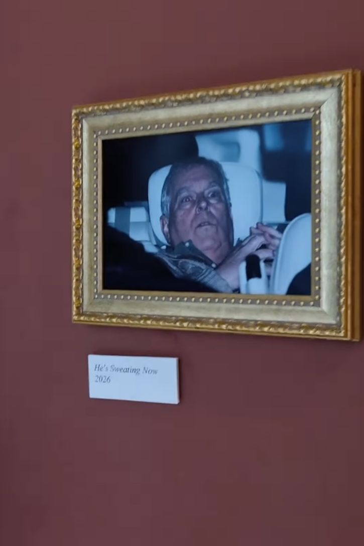 Fotoğrafta, Andrew'un BBC'ye verdiği röportajında terleyemediğini ve bu nedenle kendisini cinsel istismarla suçlayan Virginia Giuffre'nin gece kulübünde terlediğini gördüğü iddiasının yalan olduğunu öne sürmesine bir atıf bulunuyor. Şoke olmuş Andrew fotoğrafı, "Şimdi terliyor" başlığıyla küçük bir çerçeveye yerleştirilmiş halde Louvre Müzesi'nin duvarına asıldı.