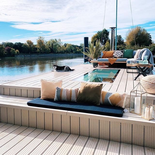 Güverteye köşe koltuğu yaptıran çift Thames Nehri'nde gezmek için küçük bir tekne de satın aldı.