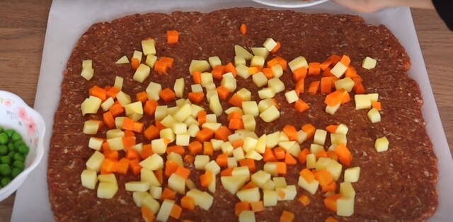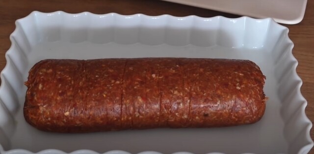 Bu aşamada iç harcı için konserve garnitür kullanabilirsiniz. Köftenin kenar tarafına iç harcınızı yerleştirdikten sonra rulo yapın ve sıkıca sarın. Üzerine yumurta akını sürdükten sonra tekrar yağlı kâğıda sarıp üzerini de alüminyum folyoyla kaplayın.