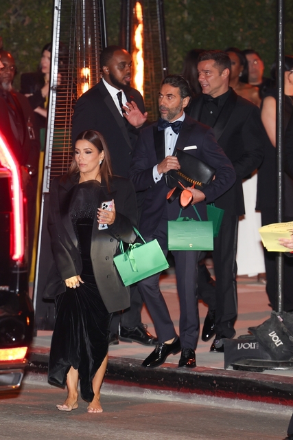Kırmızı halıda Ricky Martin ile poz veren ünlü oyuncunun çıkışta otomobiline yürürken çıkardığı yüksek topuklu ayakkabısını ve çantasını, arkasından yürüyen eşi Jose Baston taşıdı.