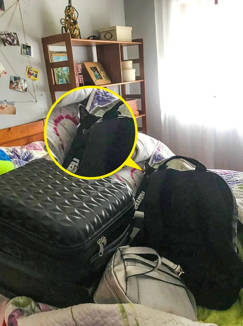 Cevap: Siyah sırt çantasının arkasında kamufle olmuş şekilde bir kedi duruyor.