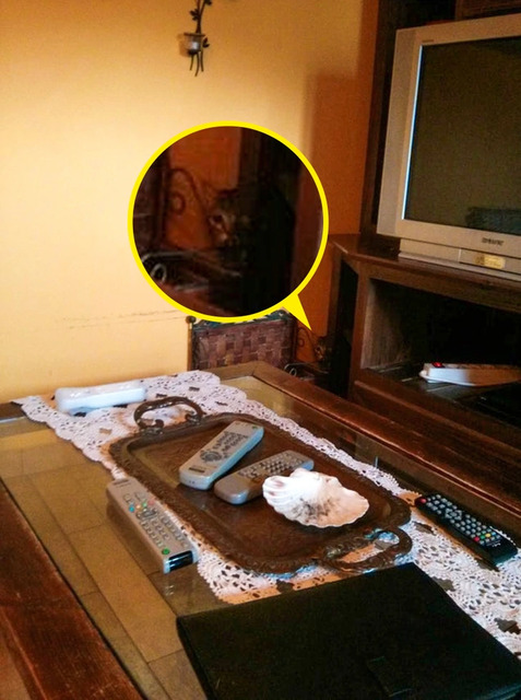 Cevap: Kedi, televizyonun köşesine saklanmış.