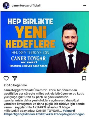 Instagram hesabından paylaşımda bulunan Caner Toygar, şu ifadelerde bulundu; "Ülkemizin zorlu bir dönemden geçtiği bu süreçte millet aşkıyla büyüyen ve bu kutlu yürüyüşe ışık tutan AK Parti ile çocuklarımızın, gençlerimizin daha yeni ufuklara açılması daha güzel yarınlara kavuşması ve daha güçlü bir Türkiye için ben de varım… AK Parti istanbul 3. bölge milletvekili aday adayı Caner Toygar"