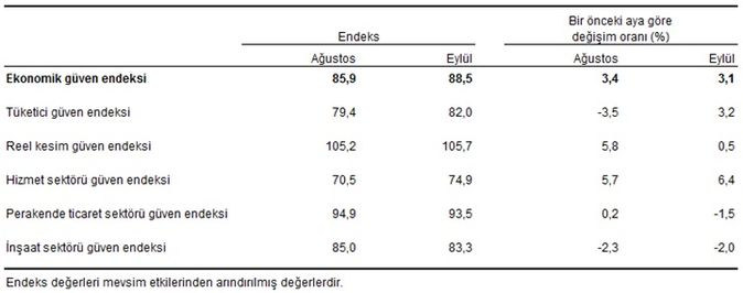 Güncelleme öncesi duruma göre hesaplanan ekonomik güven endeksi ise Eylül ayında bir önceki aya göre %3,2 oranında arttı; Ağustos ayında 85,9 olan endeks, Eylül ayında 88,6 oldu.