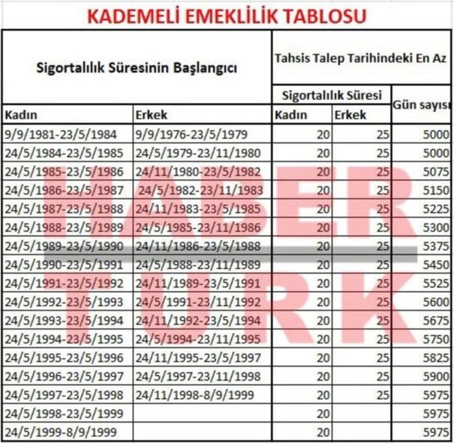4A SSK emeklilik şartlarına göre 25 yıl sigortatlılık süresini ve 5000-5975 prim gün sayısını tamamlayan erkekler; 20 yıl sigortatlılık süresini ve 5000-5975 prim gün sayısını tamamlayan kadınlar emekliliğe hak kazanıyordu.