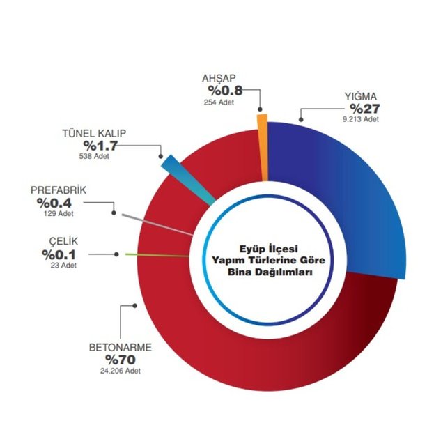 Eyüp ilçesi yapım türlerine göre bina dağılımları şu şekildedir; Ahşap 254 adet (0.8), yığma 9.213 adet (%27), tünel kalıp 538 adet (%1.7), prefabrik 129 adet (%0.4), çelik 23 adet (0.1), betonarme 24.206 adet (%70).