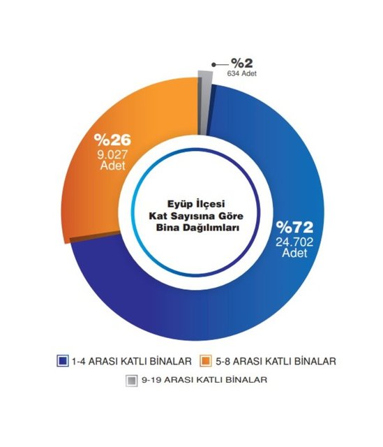 Eyüp ilçesi kat sayısına göre bina dağılımları şu şekildedir; 1-4 arası katlı binalar 24.702 adet (%72), 5-8 arası katlı binalar 9.027 adet (%26), 9-19 arası katlı binalar 634 adet (%2).
