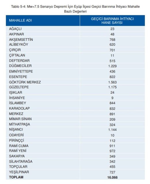**Senaryo depremi için Eyüpsultan ilçesi "Mahalle bazlı geçici barınma ihtiyacı" tahminleri