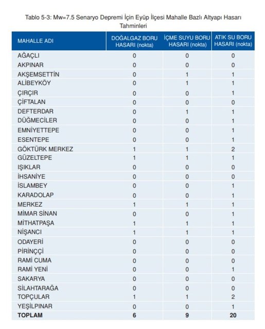 **Senaryo depremi için Eyüpsultan ilçesi "Mahalle bazlı altyapı hasarı" tahminleri