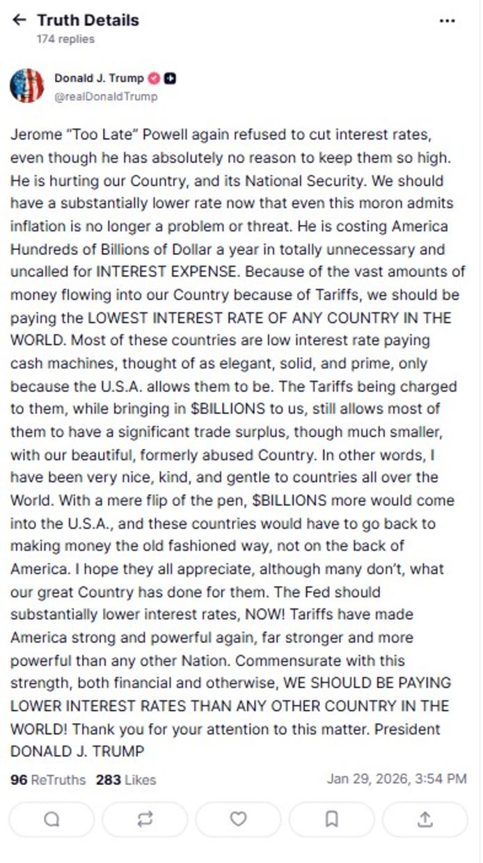 "Jerome 'Çok Geç' Powell, faiz oranlarını bu kadar yüksek tutmak için hiçbir gerekçesi olmamasına rağmen, yine faiz oranlarını düşürmeyi reddetti. Ülkemize ve ulusal güvenliğimize zarar veriyor. Bu moron bile enflasyonun artık bir sorun veya tehdit olmadığını kabul ettiğine göre, faiz oranlarımız artık önemli ölçüde daha düşük olmalı. Amerika'ya yılda yüz milyarlarca dolar tamamen gereksiz ve yersiz faiz giderine mal oluyor. Tarifeler nedeniyle Ülkemize akan muazzam miktardaki para yüzünden, DÜNYADAKİ HERHANGİ BİR ÜLKEDEN DAHA DÜŞÜK FAİZ ORANINI ödüyor olmamız gerekir. Bu ülkelerin çoğu, düşük faiz ödeyen nakit makineleri, zarif, sağlam ve birinci sınıf olarak düşünülür — ama yalnızca ABD buna izin verdiği için. Onlardan alınan tarifeler, bize MİLYAR DOLARLAR kazandırırken, çoğunun güzel, eskiden istismar edilmiş ülkemizle hâlâ, daha küçük olsa da, önemli bir ticaret fazlasına sahip olmasına izin veriyor. Başka bir deyişle, dünyanın dört bir yanındaki ülkelere karşı çok nazik, kibar ve anlayışlı davrandım. Tek bir imza ile milyarlarca dolar daha ABD'ye girer ve bu ülkeler Amerika'nın sırtından değil, eski usulde para kazanmaya geri dönmek zorunda kalırlar. Birçoğu takdir etmese de, umarım hepsi büyük ülkemizin onlar için yaptıklarını takdir eder. Fed faiz oranlarını ŞİMDİ önemli ölçüde düşürmelidir! Gümrük vergileri Amerika'yı yeniden güçlü ve kudretli hale getirdi, diğer tüm ülkelerden çok daha güçlü ve kudretli. Bu güce, hem finansal hem de diğer açılardan, DÜNYADAKİ DİĞER TÜM ÜLKELERDEN DAHA DÜŞÜK FAİZ ORANLARI ÖDEMELİYİZ!."