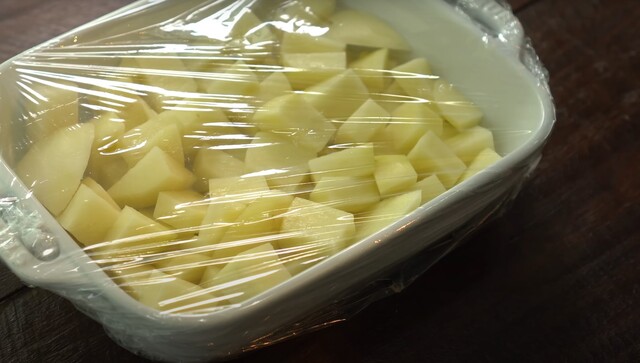 Kabın üzerine streç film serin ve mikrodalgada 700 watt ayarında 7 dakika pişirin. Eğer mikrodalganız yoksa bir tencerede patateslerinizi haşlayabilirsiniz.