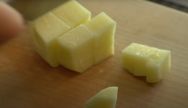 Patatesleri yıkayın ve dışlarını soyun. Sonra patatesleri küp küp doğrayın ve bir kaba alın.