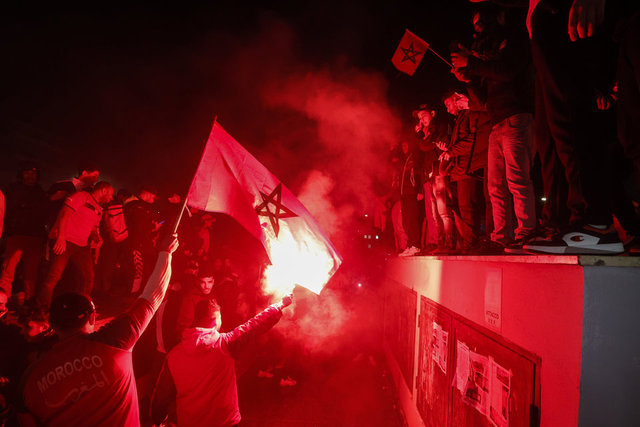 Fas bayraklarını dalgalandıran taraftarlardan bazıları, yarı final başarısını havai fişekler atarak ve meşaleler yakarak kutladı.