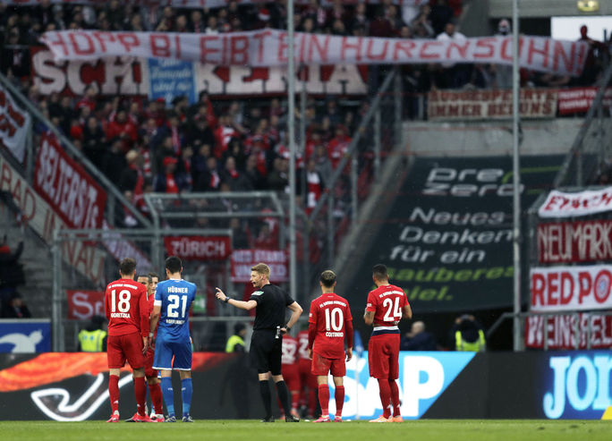 Misafir takım Bayern’in taraftarlarının oturduğu tribündeki pankartta Hoffenheim’in yatırımcısı Dietmar Hoff ‘a ağır küfürler vardı.
