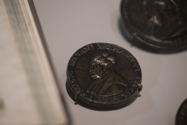 Tabloda kemerli girişin iki alt ucunda iki yazı göze çarpıyor. Zamanla kısmen okunmaz hale gelen yazılarda "1480, Kasım'ın 25'inci günü" ve Latince "Victor Orbis (Dünyanın Fatihi)" ifadesi yazıyor. Müzede biri yine Bellini tarafından yapılmış üç Fatih Sultan Mehmet kabartmalı madalyon da sergileniyor. Bellini'nin madalyonunun arkasında yine tablodaki gibi üç taç yer alıyor. Constanza de Ferrera'nın madalyonunun arkasında Fatih at üzerinde tasvir edilirken, Bertoldo di Giovanni'nin eserinin arkasında at arabası üzerinde bir genç kabartması bulunuyor.